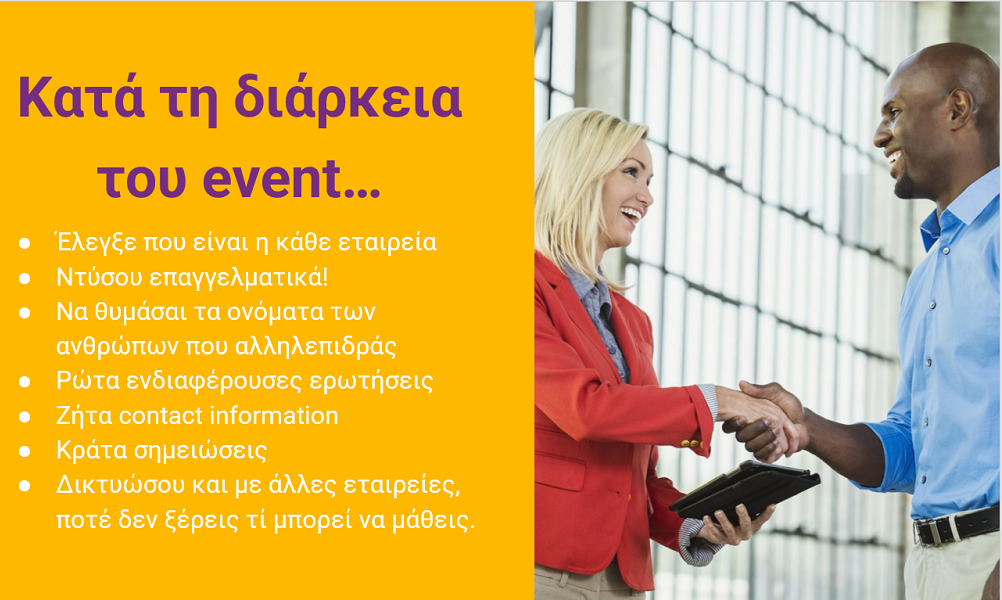 4. Μην ξεχάσεις λίγες ημέρες μετά το event να κάνεις follow up στις εταιρείες με τις οποίες ήρθες σε επικοινωνία, στέλνοντας τους ένα ευχαριστήριο mail. Με αυτό τον τρόπο θα τους υπενθυμίσεις την παρουσία σου στο event και το ενδιαφέρον σου να εργαστείς μαζί τους.