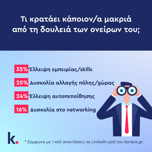 • Τέλος, ερωτηθέντες για το τι είναι αυτό που τους κρατά μακριά από τη δουλειά των ονείρων τους, απαντούν την έλλειψη εμπειρίας και δεξιοτήτων, τη δυσκολία στη μετεγκατάσταση, την έλλειψη αυτοπεποίθησης και τη δυσκολία στο networking.