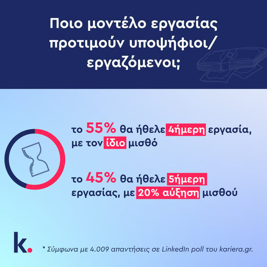 • Το 55% των ερωτηθέντων δήλωσε ότι θα προτιμούσε 4ήμερη εργασία με τον ίδιο μισθό, ενώ το 45% επισήμανε πως προτιμά 5ήμερη εργασία με 20% αύξηση μισθού.