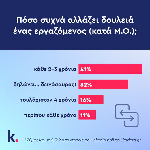 • Όσον αφορά στο κάθε πότε οι εργαζόμενοι αλλάζουν δουλειά, 41% σημείωσε πως αυτό συμβαίνει κάθε 2-3 χρόνια, 11% κάθε χρόνο, ενώ το 32% των ερωτώμενων δηλώνει… δεινόσαυρος!