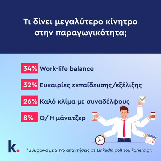• Σχετικά με την παραγωγικότητα, 34% των ερωτηθέντων υπογράμμισαν πως ο πιο σημαντικός παράγοντας είναι το work-life balance, 32% ανέφεραν τις ευκαιρίες ανέλιξης και εξέλιξης, 26% το καλό κλίμα και 8% τον καλό μάνατζερ.