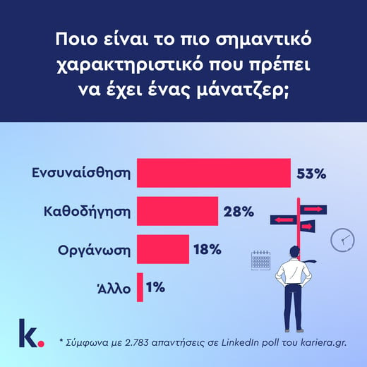 • Στο ίδιο πλαίσιο, ερωτηθέντες για το τι κάνει έναν μάνατζερ καλό, πάνω από τους μισούς απαντούν “η ενσυναίσθηση”, 1 στους 3 αναφέρει την καθοδήγηση, ενώ το 18% σημειώνει την οργάνωση.