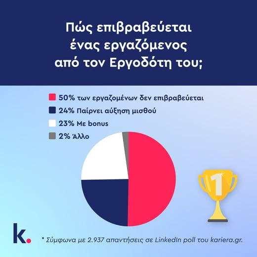 • 1 στους 2 ερωτηθέντες απάντησε πως δεν επιβραβεύεται καθόλου από τον εργοδότη του, 24% αναφέρει πως επιβραβεύεται με αύξηση μισθού, ενώ το 23% λαμβάνει bonus.