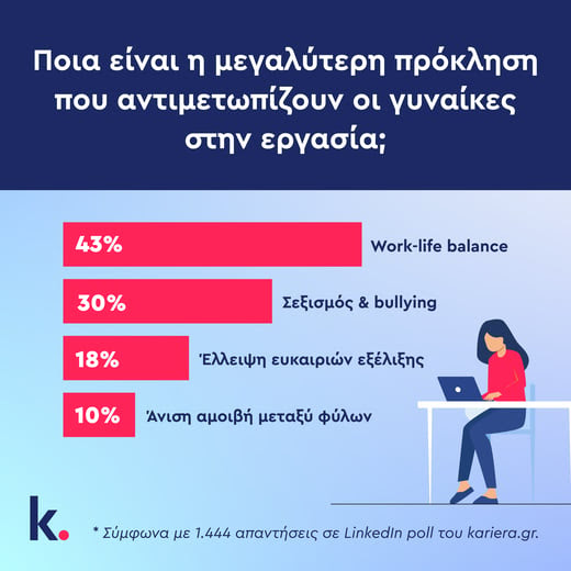 • Οι προκλήσεις που αντιμετωπίζουν οι γυναίκες στον εργασιακό στίβο στην πλειοψηφία τους αφορούν το work-life balance (43%), ενώ ακολουθούν ο σεξισμός και το bullying, η έλλειψη ευκαιριών και η άνιση αμοιβή.