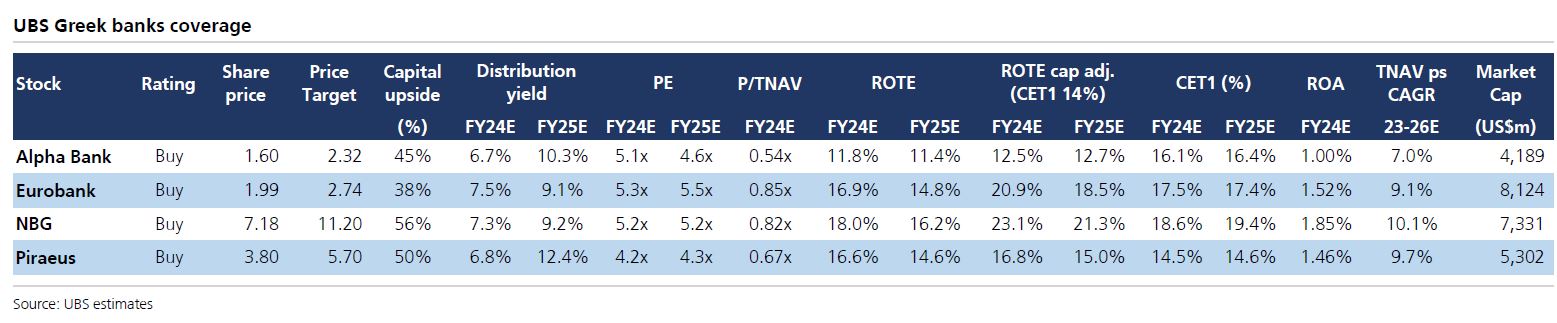 Σε αυτό το πλαίσιο, σύμφωνα με την UBS, η τιμή στόχος για την Alpha Bank είναι στα 2,32 ευρώ (σύσταση Buy), που υποδηλώνει περιθώριο ανόδου 45%, για την Eurobank στα 2,74 ευρώ (σύσταση Buy) με περιθώριο ανόδου 38%, για την Εθνική Τράπεζα (σύσταση Buy) στα 11,20 ευρώ, με περιθώριο ανόδου 56%, και για την Τράπεζα Πειραιώς (σύσταση Buy) στα 3,80 ευρώ, με περιθώριο ανόδου 50%.