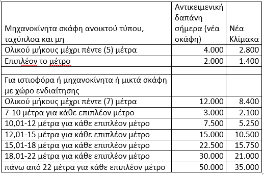 Για τα σκάφη σήμερα η τεκμαρτή δαπάνη από κάθε σκάφος μειώνεται ανάλογα με την παλαιότητά του κατά ποσοστό δεκαπέντε τοις εκατό (15%) αν έχει περάσει χρονικό διάστημα πάνω από πέντε (5) έτη και μέχρι δέκα (10) έτη από το έτος που νηολογήθηκε για πρώτη φορά και τριάντα τοις εκατό (30%) αν έχει περάσει χρονικό διάστημα πάνω από δέκα (10) έτη.