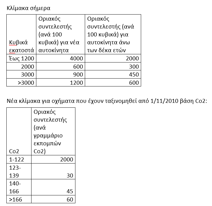 Σήμερα τα αυτοκίνητα υπόκεινται σε αντικειμενικές δαπάνες βάση των κυβικών εκατοστών αποκλειστικά. Επίσης υπάρχει μείωση του ποσού ανάλογα με την παλαιότητα 30% για αυτοκίνητα 5-10 ετών και 50% για αυτοκίνητα άνω των 10 ετών. Ωστόσο το κόστος συντήρησης δεν είναι υψηλότερο για τα νεότερα αυτοκίνητα έναντι των παλαιότερων, ενώ η παρούσα κατάσταση λειτουργεί αποτρεπτικά για την αγορά νεότερου αυτοκινήτου κάτω της δεκαετίας.