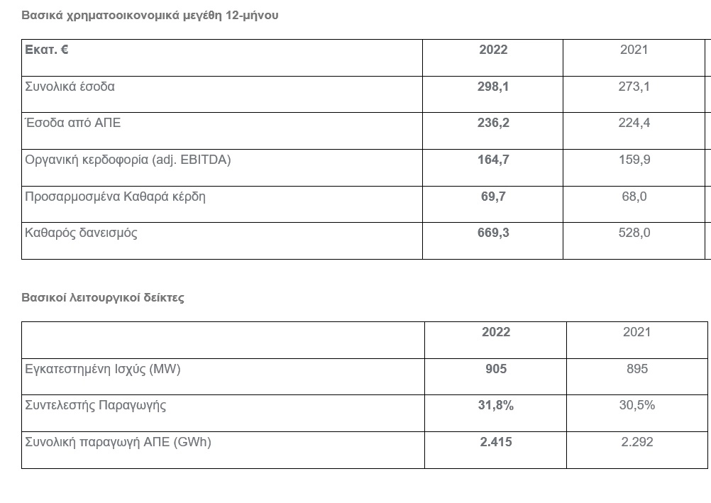 Τα προσαρμοσμένα λειτουργικά κέρδη προ φόρων, τόκων και αποσβέσεων (προσαρμοσμένο EBITDA) από συνεχιζόμενες δραστηριότητες του Ομίλου ανήλθαν σε € 164,7 εκατ. έναντι € 159,9 εκατ. κατά την προηγούμενη χρήση, με το αντίστοιχο περιθώριο να ανέρχεται στο 55,2% έναντι 58,6% το 2021, ως αποτέλεσμα αυξημένων εξόδων για ανάπτυξη νέων έργων και συντηρήσεων. Σημειώνεται ότι κατά το έτος 2022 οι νέες επενδύσεις του ομίλου σε αιολικά πάρκα δεν είχαν ουσιαστική συνεισφορά στην κερδοφορία, κάτι που αναμένεται να συμβεί σταδιακά από το 2023.