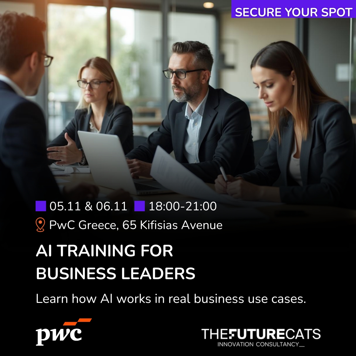 Μετά την εντυπωσιακή ανταπόκριση και το sold-out του πρώτου, ανακοινώνεται το 2ο training του καινοτόμου εκπαιδευτικού προγράμματος, ‘AI Executive for Business in Action’, από τη TheFutureCats Innovation Consultancy σε συνεργασία με την PwC Greece. Η εκπαίδευση θα πραγματοποιηθεί στις 5 & 6 Νοεμβρίου 2025, 18:00-21:00, στις εγκαταστάσεις της PwC The Circle, Λ. Κηφισίας 65.