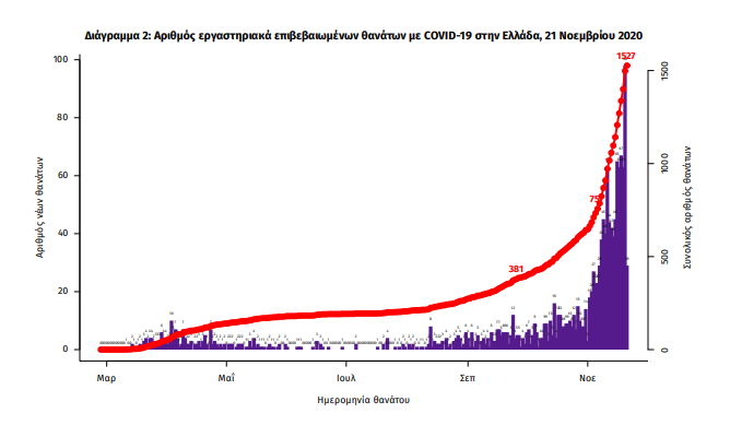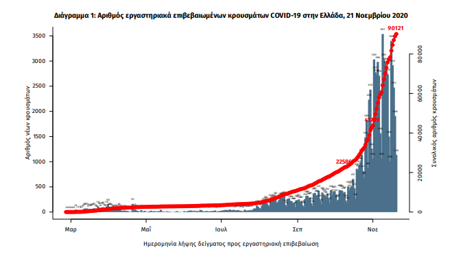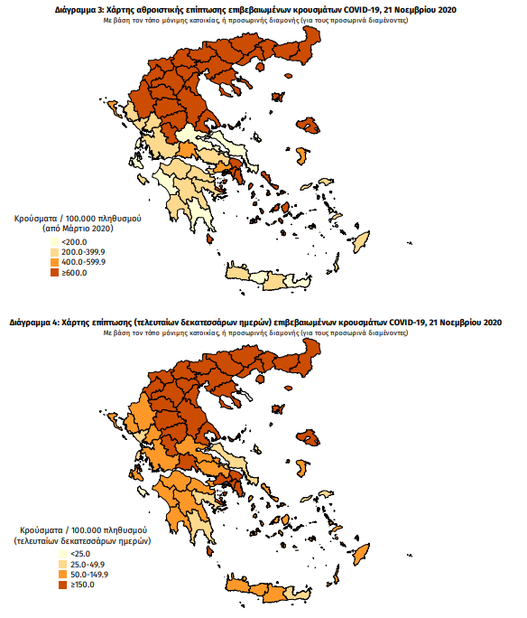 Τα στοιχεία που παρουσιάζονται αφορούν περιστατικά από την επιδημιολογική επιτήρηση της νόσου από το νέο κορωνοϊό (COVID-19), με βάση τα δεδομένα που έχουν δηλωθεί στον ΕΟΔΥ και καταγραφεί μέχρι τις 21 Νοεμβρίου 2020 (ώρα 15:00).