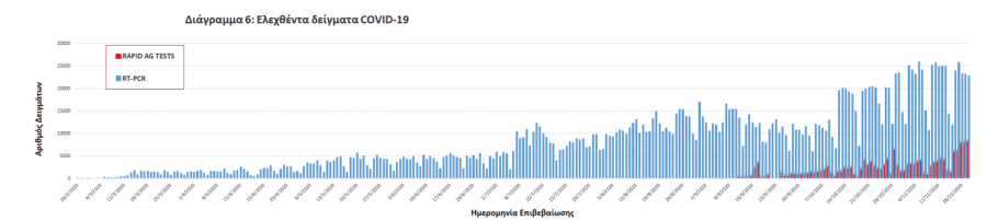 Δείγματα που έχουν ελεγχθεί: Από την 1η Ιανουαρίου 2020 μέχρι σήμερα, στα εργαστήρια που διενεργούν ελέγχους για τον νέο κορωνοϊό (SARS-CoV-2) και που δηλώνουν συστηματικά στον ΕΟΔΥ το σύνολο των δειγμάτων που ελέγχουν, έχουν συνολικά ελεγχθεί 2.223.225 κλινικά δείγματα ενώ από Μονάδες Υγείας και Κλιμάκια του ΕΟΔΥ που διενεργούν ελέγχους Rapid Ag έχουν ελεγχθεί 149.359 δείγματα.