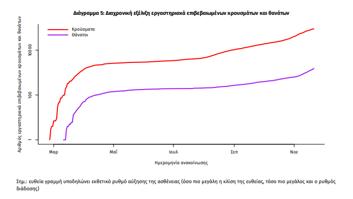 Η διαχρονική εξέλιξη των συνολικών κρουσμάτων και συνολικού αριθμού των θανάτων ασθενών COVID-19 παρουσιάζεται στο ακόλουθο διάγραμμα (σε λογαριθμική κλίμακα).