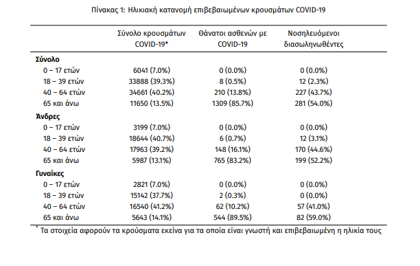 Η μέση ηλικία των κρουσμάτων είναι 42 έτη (εύρος 0 έως 104 ετών), ενώ η μέση ηλικία των θανάτων είναι 80 έτη (εύρος 25 έως 103 ετών). Η ηλικιακή κατανομή των (α) συνολικών κρουσμάτων, (β) των περιστατικών που κατέληξαν σε θάνατο και (γ) των ασθενών που νοσηλεύονται διασωληνωμένοι, είναι η ακόλουθη: