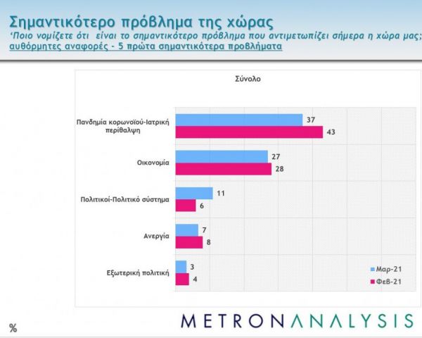 Παράλληλα, οι εντυπώσεις για το έργο της κυβέρνησης στην υπόθεση του κοροναϊού δεν είναι και τόσο καλές. Όταν τον Νοέμβριο οι θετικές γνώμες ήταν στο 50% και τον Μάρτιο έπεσε στο 40% τότε θα πρέπει να χτυπήσει καμπανάκι για την κυβέρνηση καθώς ο κόσμος ενδεχομένως έχει κουραστεί από τα απανωτά lockdown και τις οικονομικές συνέπειες της υγειονομικής κρίσης.