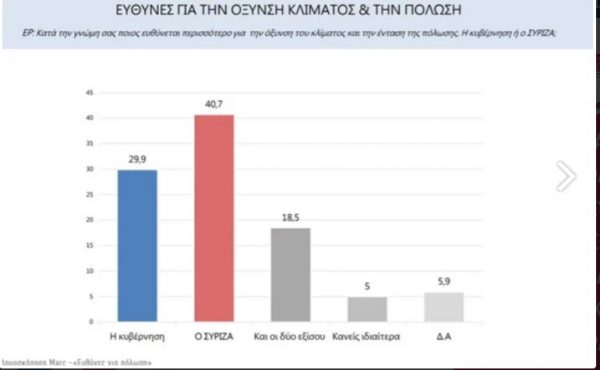 Σύμφωνα με την Interview, το 40,7% πιστεύει πως τη μεγαλύτερη ευθύνη για την όξυνση της πολιτικής κατάστασης έχει ο ΣΥΡΙΖΑ, με το 29,9% να απαντά η ΝΔ. Ποσοστό 18,5% δηλώνει πως ευθύνονται το ίδιο.