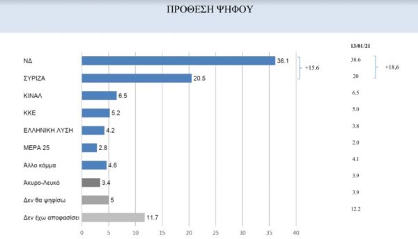 Η ΝΔ συγκεντρώνει ποσοστό 37% στην πρόθεση ψήφου, έναντι 22% του ΣΥΡΙΖΑ.