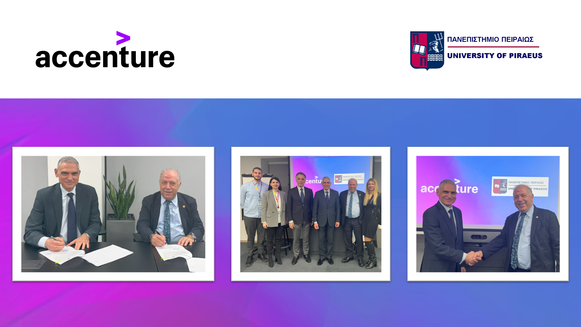 Παρόντες κατά την υπογραφή του Μνημονίου Συνεργασίας ήταν ο Κοσμήτορας της Σχολής Ναυτιλίας και Βιομηχανίας Καθηγητής Άγγελος Παντουβάκης, και από την Accenture, η Μαρία Οικονόμου, Financial Services Managing Director, καθώς επίσης η Βάσω Κούσαντα και ο Τέλης Μαμούρης από την ομάδα του HR.