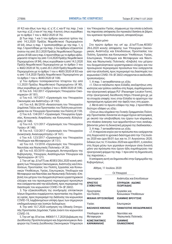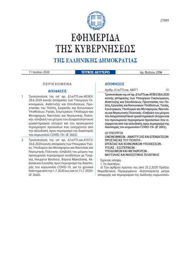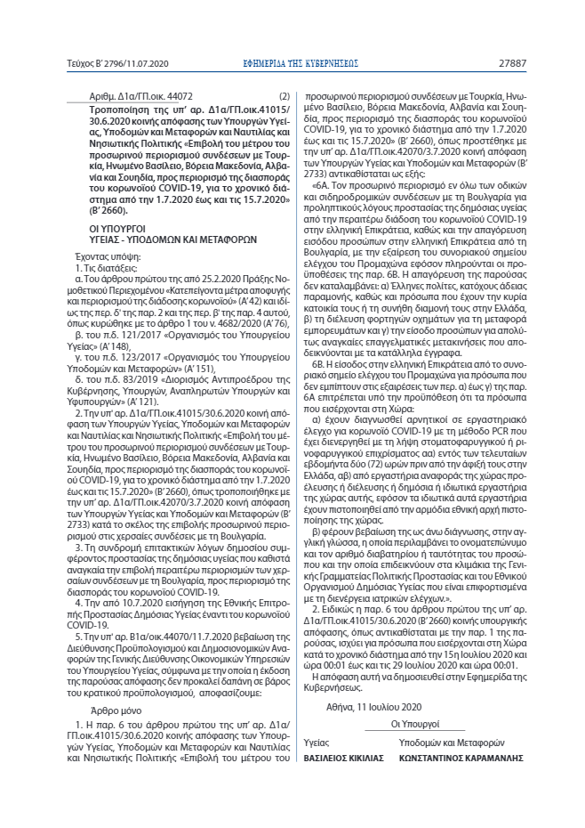 α) έχουν διαγνωσθεί αρνητικοί σε εργαστηριακό έλεγχο για κορωνοϊό COVID-19 με τη μέθοδο PCR που έχει διενεργηθεί με τη λήψη στοματοφαρυγγικού ή ρινοφαρυγγικού επιχρίσματος εντός των τελευταίων εβδομήντα δύο (72) ωρών πριν από την άφιξή τους στην Ελλάδα. Ο έλεγχος πρέπει να έχει γίνει από εργαστήρια αναφοράς της χώρας προέλευσης ή διέλευσης ή δημόσια ή ιδιωτικά εργαστήρια της χώρας αυτής, εφόσον τα ιδιωτικά αυτά εργαστήρια έχουν πιστοποιηθεί από την αρμόδια εθνική αρχή πιστοποίησης της χώρας.