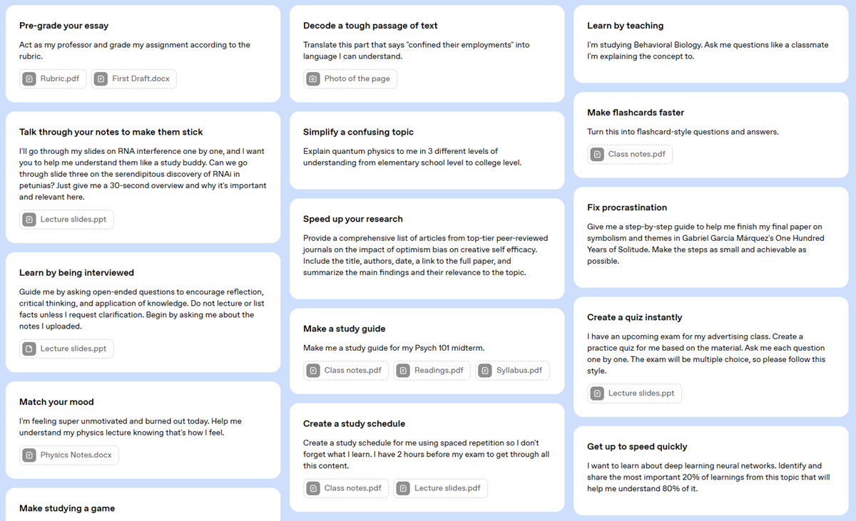 Στην κατηγορία των σπουδών, οι φοιτητές χρησιμοποιούν το ChatGPT ως έναν εξατομικευμένο, διαδραστικό δάσκαλο. Αντί να ζητούν έτοιμες απαντήσεις, αναθέτουν στο AI συγκεκριμένους ρόλους. Εντολές όπως «Παίξε τον ρόλο του Σωκράτη και βοήθησέ με να κατανοήσω ένα θέμα κάνοντας ερωτήσεις» ή «Εξήγησέ μου τη Θεωρία της Σχετικότητας σαν να ήμουν πέντε ετών» κυριαρχούν. Αυτή η προσέγγιση, γνωστή ως “Study Mode”, ενθαρρύνει την κριτική σκέψη αντί της παθητικής κατανάλωσης πληροφοριών. Άλλες δημοφιλείς εντολές περιλαμβάνουν τη δημιουργία εξατομικευμένων προγραμμάτων μελέτης, την εύρεση των δυνατών και αδύναμων σημείων ενός επιχειρήματος για προετοιμασία debate, ή ακόμα και απλές εργασίες όπως η εύρεση συνωνύμων για τη λέξη “sophisticated”.