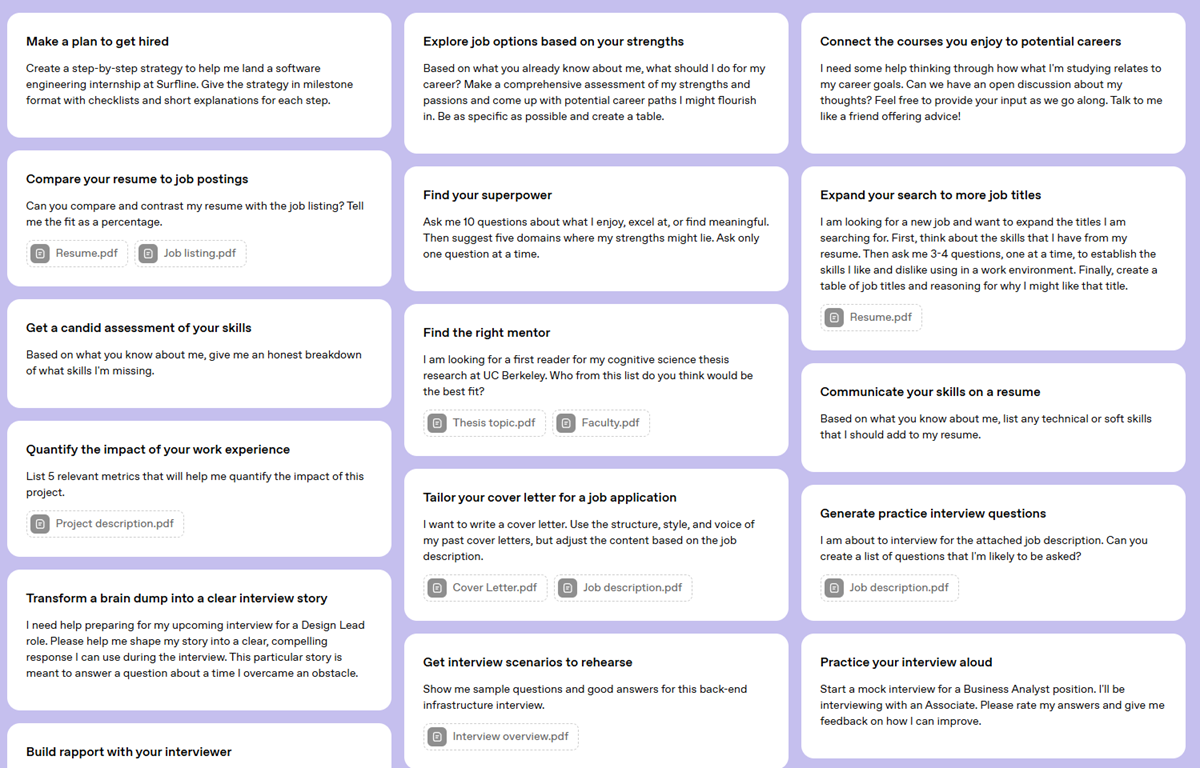 Στον τομέα της καριέρας, το ChatGPT μετατρέπεται σε έναν ψηφιακό σύμβουλο επαγγελματικού προσανατολισμού. Οι φοιτητές ζητούν βοήθεια για να προετοιμαστούν για συνεντεύξεις σε συγκεκριμένες εταιρείες, να συντάξουν επαγγελματικά email δικτύωσης, να δημιουργήσουν εξατομικευμένες συνοδευτικές επιστολές προσαρμοσμένες σε αγγελίες εργασίας, ακόμα και να προσομοιώσουν μια δύσκολη διαπραγμάτευση μισθού. Οι εντολές αυτές καταδεικνύουν μια στρατηγική χρήση του AI για την απόκτηση ανταγωνιστικού πλεονεκτήματος σε μια απαιτητική αγορά εργασίας.