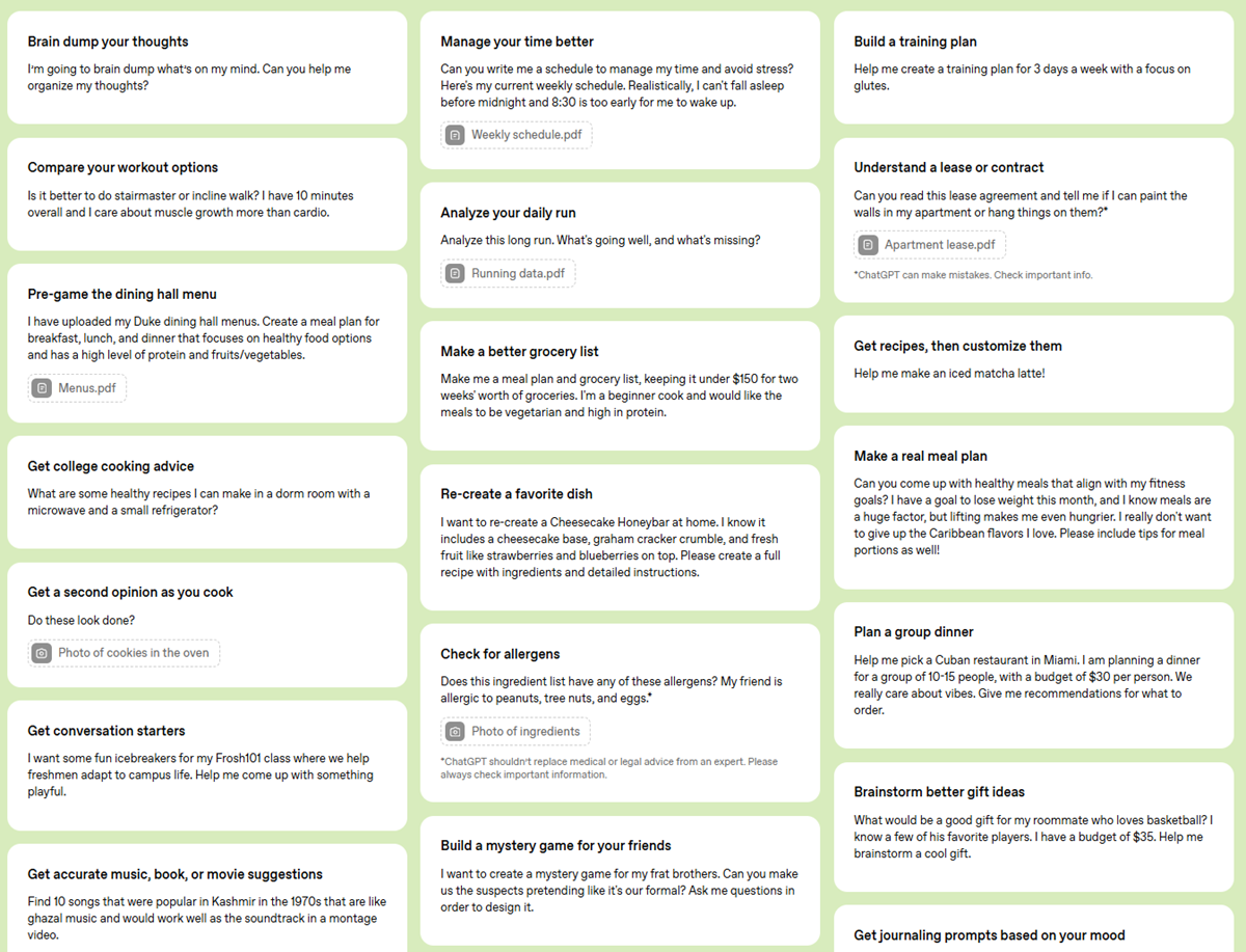 Το εγχείρημα, με την ονομασία “ChatGPT Lab”, περιελάμβανε εβδομαδιαίες εικονικές συναντήσεις όπου οι συμμετέχοντες, που επιλέχθηκαν μετά από αίτηση, μοιράζονταν, βελτίωναν και τελικά ψήφιζαν τις πιο αποτελεσματικές εντολές. «Προσκαλέσαμε 70 φοιτητές στο ChatGPT Lab για να ανταλλάξουν τις καλύτερες συνομιλίες τους», έγραψε ο Nick Turley, επικεφαλής του ChatGPT. Το αποτέλεσμα είναι μια πλούσια συλλογή, οργανωμένη σε τρεις βασικές κατηγορίες: «Σπουδές», «Καριέρα» και «Ζωή», η οποία δείχνει ότι η χρήση του AI εκτείνεται πολύ πέρα από τις απλές ακαδημαϊκές εργασίες.