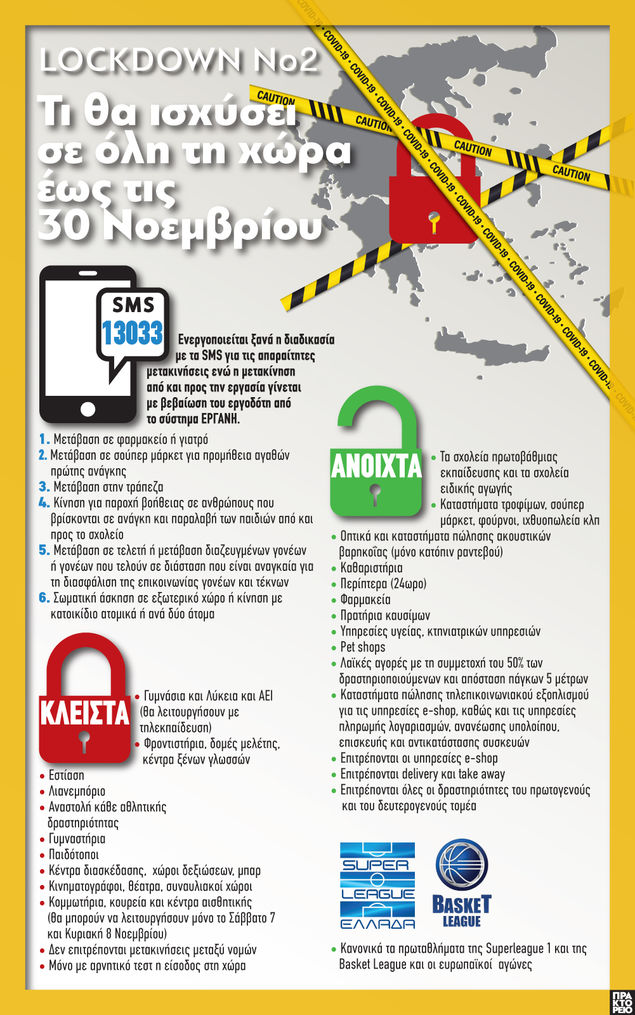 Όπως και την άνοιξη, από το Σάββατο 7/11 και για 3 εβδομάδες ισχύουν περιορισμοί στην κυκλοφορία των πολιτών, καθώς οι μετακινήσεις επιτρέπονται για μετάβαση από και προς την εργασία ή συνοδεύοντας το παιδί στο σχολείο, αλλά και για λόγους έκτακτης ανάγκης.
