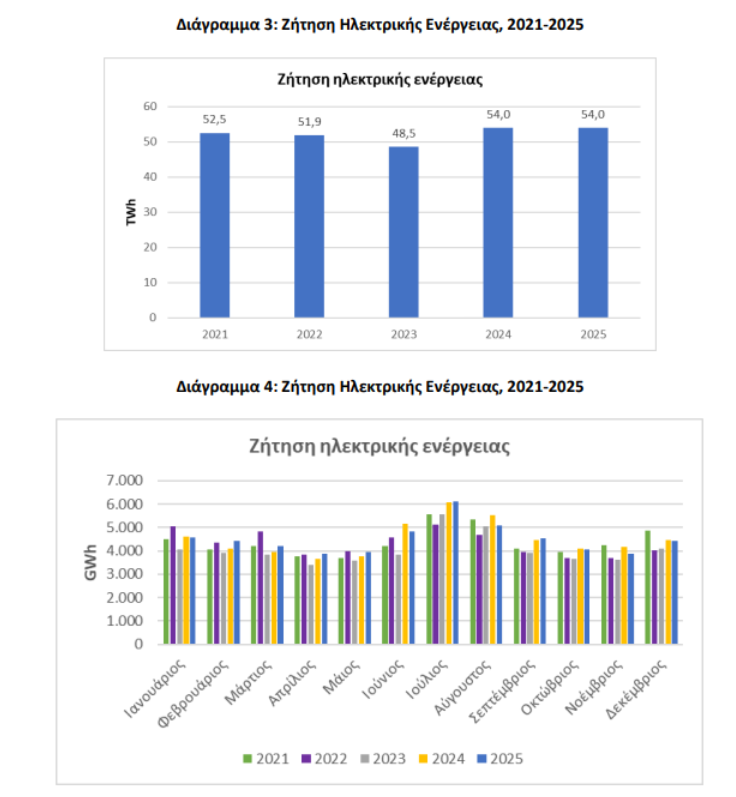 Σύμφωνα με στοιχεία της μελέτης, η ζήτηση ηλεκτρικής ενέργειας στην Ελλάδα διαμορφώθηκε στις 54 TWh το 2025, αμετάβλητη σε σύγκριση με το 2024. Σε βάθος πενταετίας (2021-2025), η ζήτηση ηλεκτρικής ενέργειας το 2025 βρισκόταν στο υψηλότερο επίπεδο, όπως και το 2024.