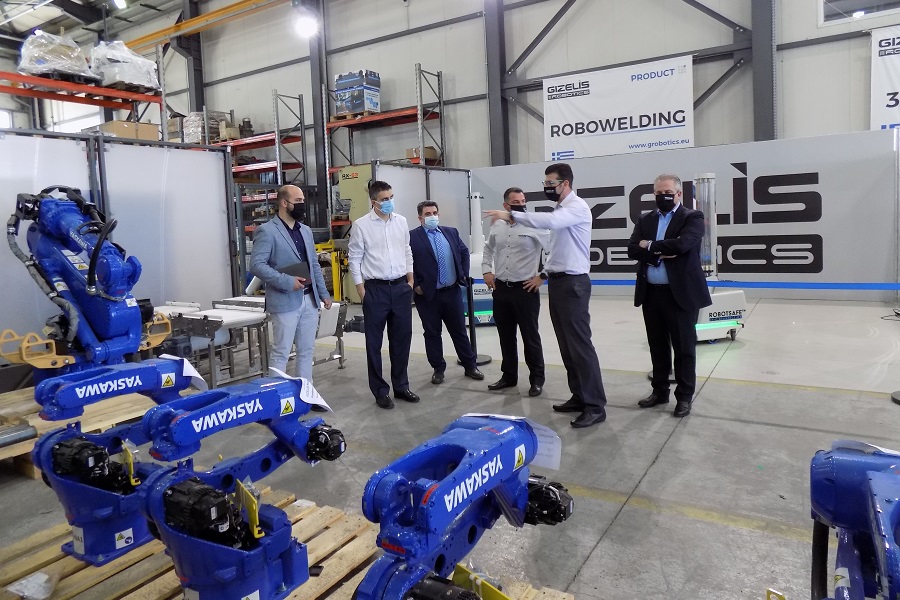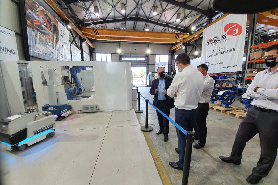 Τις εγκαταστάσεις της Gizelis Robotics στο Σχηματάρι επισκέφθηκε ο Υφυπουργός Ανάπτυξης και Επενδύσεων κ. Χρίστος Δήμας, σήμερα (Μ. Δευτέρα, 26/04/2021). Τον κ. Δήμα υποδέχθηκαν και ξενάγησαν στις παραγωγικές γραμμές και στους χώρους Έρευνας και Ανάπτυξης τους εργοστασίου, οι κκ. Ευάγγελος Γκιζελής, Ιδρυτής και Πρόεδρος, Παναγιώτης Λάγιος, CTO και Γεράσιμος Γερολυμάτος, Γενικός Διευθυντής της Gizelis Robotics. Η σημερινή επίσκεψη του κ. Δήμα πραγματοποιήθηκε σε συνέχεια της πρόσφατης επίσκεψής του μαζί με τον Πρωθυπουργό, στο σύγχρονο «smart Factory» της Calpak, το οποίο φέρει την μοναδική τεχνολογική υπογραφή της Gizelis Robotics. Το εργοστάσιο της Calpak, με τα ολοκληρωμένα συστήματα robots και cobots που έχουν κυριολεκτικά μεταμορφώσει την παραγωγική διαδικασία, είναι ένα από τα έργα Industry 4.0 που η Gizelis Robotics τρέχει στην ελληνική και διεθνή αγορά.