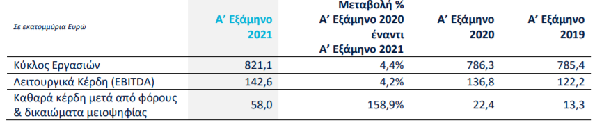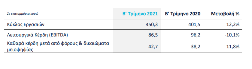 Τα λειτουργικά κέρδη (EBITDA) διαμορφώθηκαν στα €142,6 εκ., παρουσιάζοντας αύξηση 4,2% (και 10,3% σε τοπικά νομίσματα), καθώς η άνοδος των τιμών ενέργειας και ναύλων λειτούργησε ανασταλτικά. Τα καθαρά κέρδη μετά από φόρους και δικαιώματα μειοψηφίας υπερδιπλασιάστηκαν και διαμορφώθηκαν στα €58,0 εκ. έναντι €22,4 εκ. κατά το πρώτο εξάμηνο του 2020, υποβοηθούμενα από τη σημαντική μείωση των χρηματοοικονομικών εξόδων.