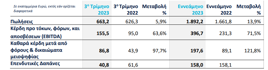 Τα καθαρά κέρδη υπερδιπλασιάστηκαν σε €198 εκ. το εννεάμηνο του 2023 και τα κέρδη ανά μετοχή (9μήνου) διαμορφώθηκαν στα €2,64.