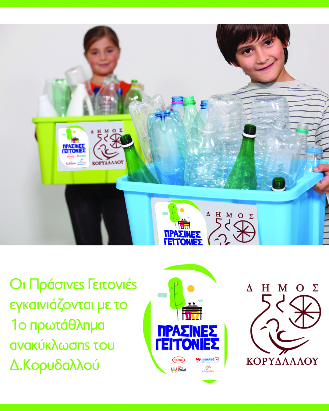 Η φετινή σχολική χρονιά ξεκινάει με το 1ο Σχολικό Πρωτάθλημα Ανακύκλωσης για τους μαθητές Πρωτοβάθμιας Εκπαίδευσης του Δήμου Κορυδαλλού. Στο πλαίσιο της πρωτοβουλίας «Πράσινες Γειτονιές», που υλοποιείται από τον τομέα Απορρυπαντικών και Προϊόντων Οικιακής Φροντίδας της Henkel Hellas σε αποκλειστική συνεργασία με τα My market, ο Δήμος Κορυδαλλού εγκαινιάζει ένα πρωτοποριακό εκπαιδευτικό πρόγραμμα ανακύκλωσης στα 15 Δημοτικά σχολεία του.