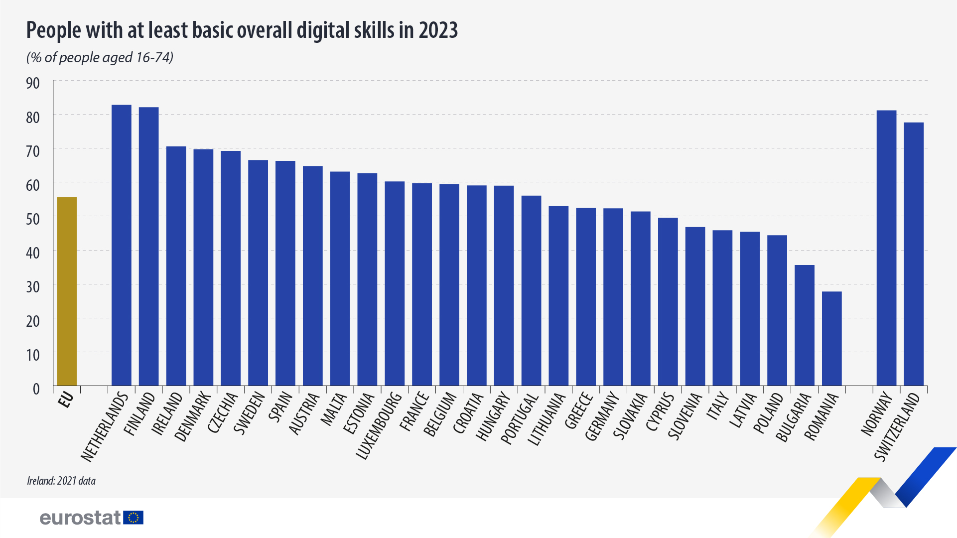 Λίγο παραπάνω από 1 στους 2 Έλληνες διαθέτει βασικές ψηφιακές δεξιότητες, σύμφωνα με στοιχεία της Eurostat για την Ευρωπαϊκή Ένωση που αφορούν στοιχεία για το 2023 και τα οποία δημοσιεύτηκαν την Παρασκευή.