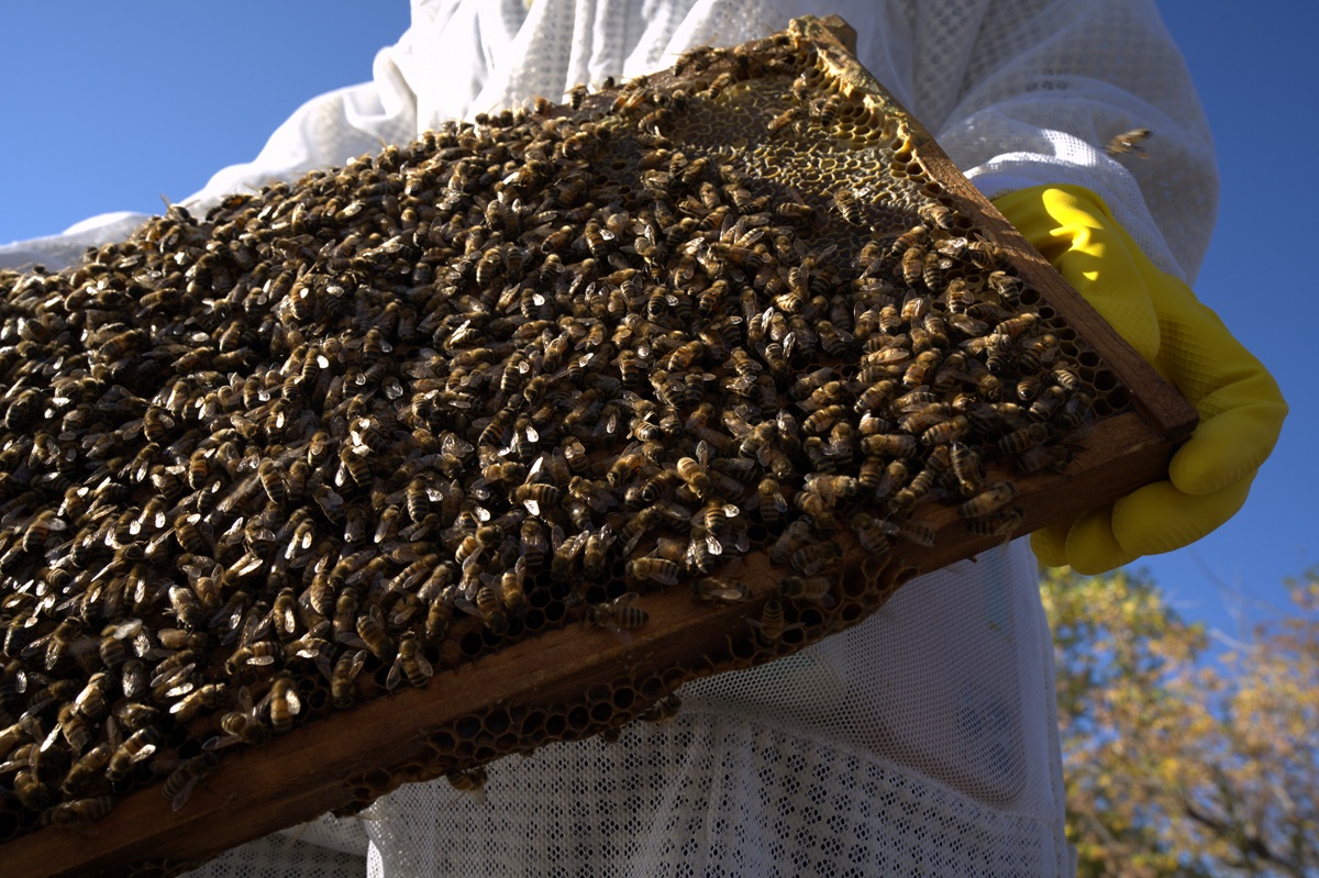 A beekeeper holds a honey frame which has a large group of honey bees on it at the University of Colorado. (credit: National Geographic/Ryan Tidman)