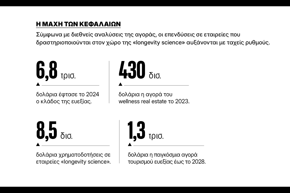 Οι εικόνες αυτές αποτυπώνουν μια ευρύτερη αλλαγή που συντελείται διεθνώς γύρω από τη μακροζωία. Η προοπτική μιας μεγαλύτερης και κυρίως υγιέστερης ζωής δεν αποτελεί πλέον μόνο αντικείμενο επιστημονικής έρευνας ή φιλοσοφικής αναζήτησης. Τα τελευταία χρόνια εξελίσσεται σταδιακά σε ένα από τα πιο δυναμικά επενδυτικά πεδία της παγκόσμιας οικονομίας, με την πρόοδο της επιστήμης, τη γήρανση των κοινωνιών και την αυξανόμενη ζήτηση για καλύτερη ποιότητα ζωής να τροφοδοτούν την ανάπτυξη μιας νέας αγοράς. Αν το wellness των προηγούμενων δεκαετιών επικεντρωνόταν κυρίως στην ευεξία και στον υγιεινό τρόπο ζωής, η νέα τάση που διαμορφώνεται διεθνώς στρέφεται πλέον προς τη μακροζωία, δηλαδή στην προσπάθεια να παραταθούν όχι μόνο τα χρόνια ζωής, αλλά κυρίως τα χρόνια καλής υγείας.