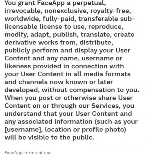 Ενώ σύμφωνα με τους όρους του FaceApp οι άνθρωποι εξακολουθούν να κατέχουν το δικό τους «περιεχόμενο χρήστη» (δηλαδή τις φωτογραφίες με το πρόσωπό τους), η εταιρεία κατέχει μια άνευ χρονικού ορίου και αμετάκλητη άδεια χωρίς δικαιώματα, για να κάνει ό, τι θέλει μαζί με αυτό. Χορηγείτε στο FaceApp μια αέναη, αμετάκλητη, μη αποκλειστική, απεριόριστη, παγκόσμια, άνευ οικονομικών απαιτήσεων άδεια χρήσης για αναπαραγωγή, τροποποίηση, προσαρμογή, δημοσίευση, μετάφραση, δημιουργία παράγωγων έργων, αναφέρουν μεταξύ άλλων οι όροι.