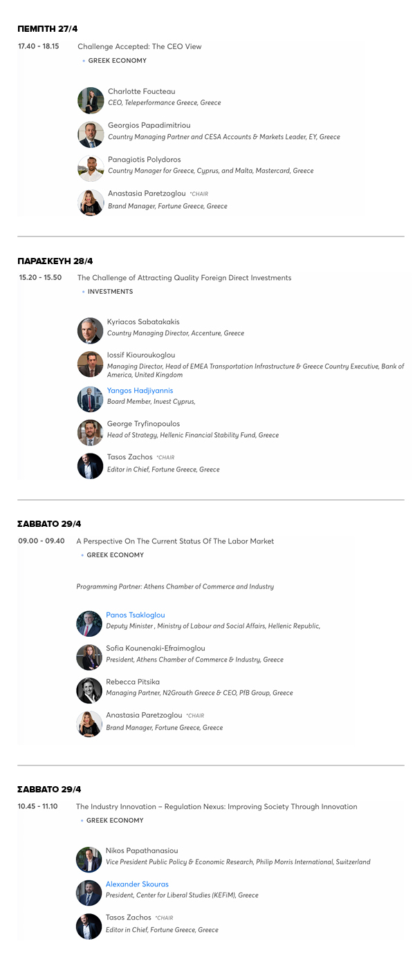 Επιπλέον κατά τη διάρκεια του Φόρουμ, η δημοσιογραφική ομάδα του Fortune Greece θα συμμετέχει σε μια σειρά από discussion panels με βασικά θέματα την οικονομία, τις επιχειρήσεις, την τεχνολογία και την προσέλκυση επενδύσεων: