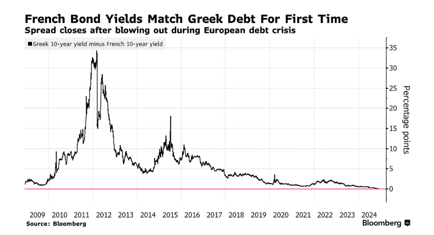 Το επιτόκιο των 10ετών γαλλικών ομολόγων, που παραδοσιακά θεωρούνται από τα ασφαλέστερα της ευρωζώνης και αξιολογούνται με ΑΑ- από την S&P Global Ratings, αυξήθηκε έως και 3,03%. Αυτό είναι το ίδιο με τα συγκρίσιμα ελληνικά ομόλογα, τα οποία μόλις πέρυσι εξακολουθούσαν να κατατάσσονται ως «σκουπίδια» από μεγάλους οίκους αξιολόγησης.