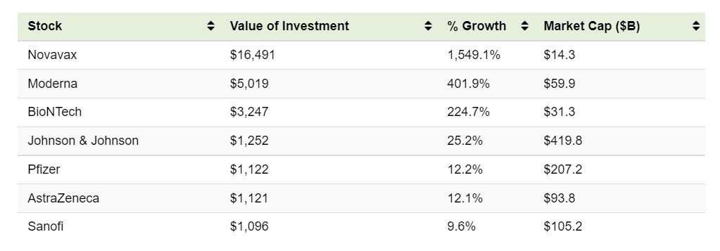 Τη μεγαλύτερη απόδοση σε μία επένδυση 1.000 δολ. που έγινε την περίοδο 11-3-2020 με 31-3-2021 την είχε η Νovavax φτάνοντας τα 1.549% (έφτασε στα 16.491 δολ.), ακολουθεί η Μoderna με 401,9% (έγιναν 5.019 δολ.), η ΒιοΝΤech με 224,7% (3.247 δολ ), η Johnson & Johnson με 25,2% (1.252 δολ.), η Pfizer με 12,2% (1.122 δολ.), η ΑstraZeneca με 12,1% (1121 δολ.) και η Sanofi με 9,6% (1.096 δολ.) .