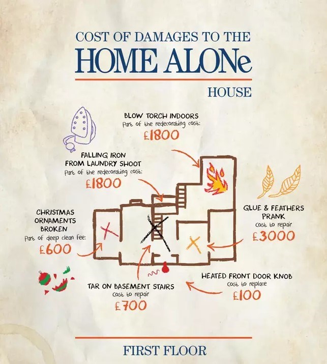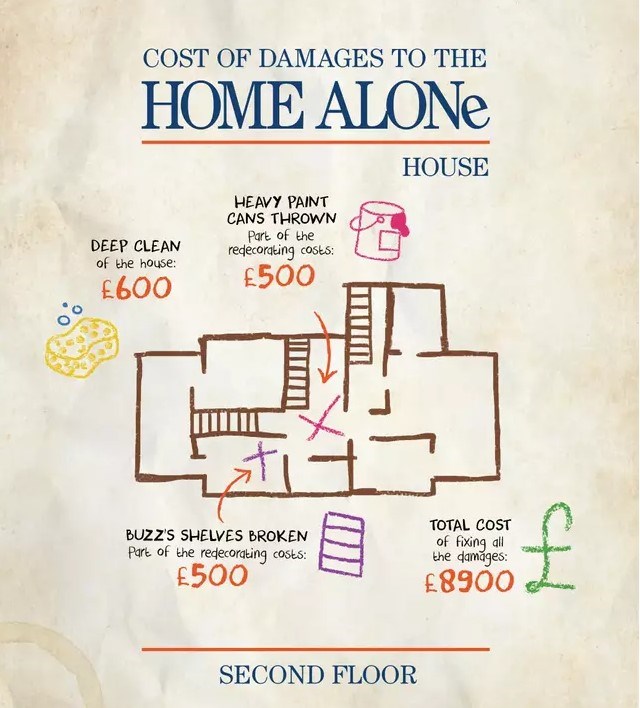 Τις καταστροφές αυτές, υπολόγισε ο Carl Goulding από το Mybuilder.com. Όπως μπορείτε να δείτε, ο Goulding σχεδίασε την κάτοψη του κάθε ορόφου και σημείωσε την κάθε ζημιά που προκλήθηκε στην προσπάθεια του μικρού πρωταγωνιστή να αποφύγει τους «κακούς». Παράλληλα, υπολόγισε και το κοστολόγιο αποκατάστασης αυτών των καταστροφών, με το συνολικό ποσό να ξεπερνά τις 10.000 ευρώ.