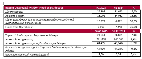 ▪ Τα Κεφάλαια από Λειτουργικές Δραστηριότητες (Funds from Operations) ανήλθαν σε 9,9 εκατ. ευρώ έναντι 7,3 εκατ. ευρώ (αυξημένα κατά 36,8%) σε σχέση με το Α’ Εξάμηνο 2024.