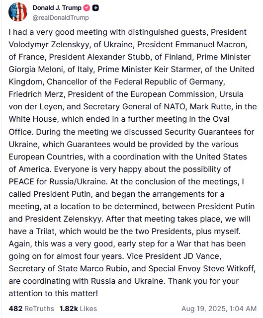 «Είχα μια πολύ καλή συνάντηση με διακεκριμένους καλεσμένους: τον πρόεδρο Βολοντίμιρ Ζελένσκι της Ουκρανίας, τον πρόεδρο Εμανουέλ Μακρόν της Γαλλίας, τον πρόεδρο Αλεξάντερ Στουμπ της Φινλανδίας, την πρωθυπουργό Τζόρτζια Μελόνι της Ιταλίας, τον πρωθυπουργό Κιρ Στάρμερ του Ηνωμένου Βασιλείου, τον καγκελάριο της Ομοσπονδιακής Δημοκρατίας της Γερμανίας, Φρίντριχ Μερτς, την πρόεδρο της Ευρωπαϊκής Επιτροπής, Ούρσουλα φον ντερ Λάιεν, και τον Γενικό Γραμματέα του ΝΑΤΟ, Μαρκ Ρούτε, στον Λευκό Οίκο, η οποία κατέληξε σε μια περαιτέρω συνάντηση στο Οβάλ Γραφείο.
