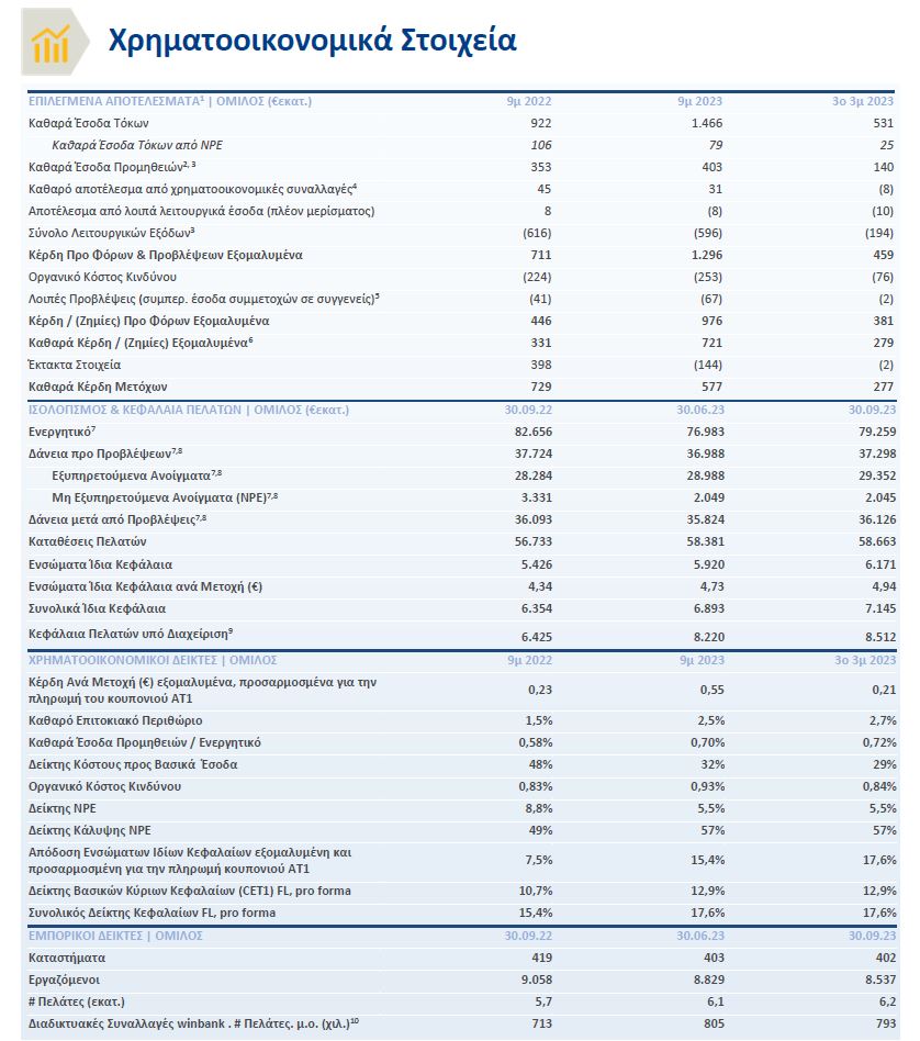 Κατά το 9μηνο 2023 τα εξομαλυμένα κέρδη ανά μετοχή ανήλθαν σε 0,55 ευρώ με RoaTBV 15,4%, υπερβαίνοντας τις εκτιμήσεις για το έτος 2023.