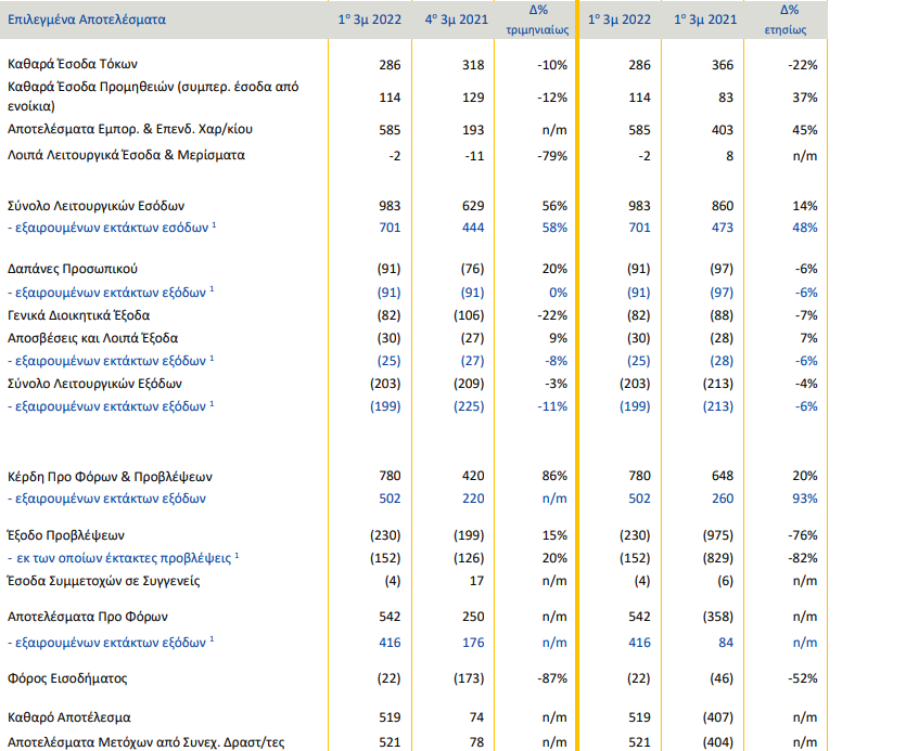 Το προ φόρων αποτέλεσμα το 1ο 3μηνο 2022 διαμορφώθηκε σε κέρδη €542 εκατ., ενώ το προ φόρων αποτέλεσμα σε επαναλαμβανόμενη βάση ανήλθε σε κέρδος €416 εκατ. Το καθαρό αποτέλεσμα μετόχων του Ομίλου ανήλθε σε κέρδος €521 εκατ. το 1ο 3μηνο 2022, από ζημία €404 εκατ. ένα χρόνο πριν.