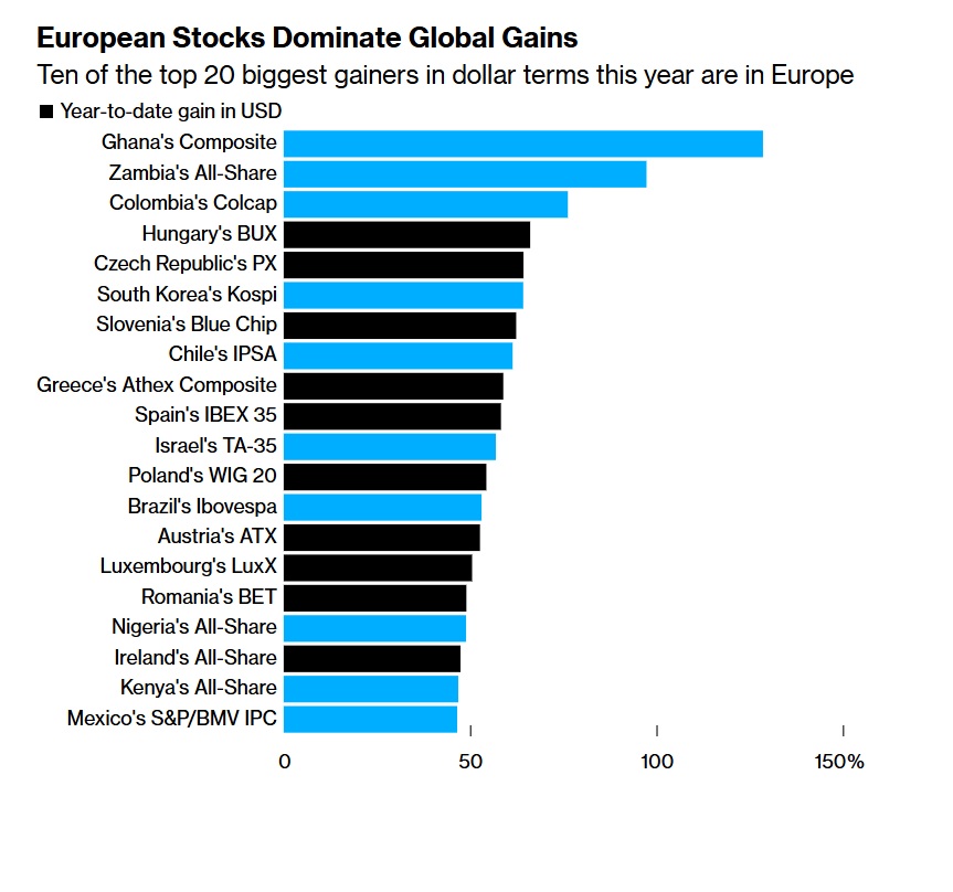Στις τάξεις των 20 χρηματιστηρίων με τις καλύτερες επιδόσεις παγκοσμίως φέτος, κάθε δεύτερος δείκτης είναι ευρωπαϊκός. Πρόκειται για ένα επίτευγμα που η περιοχή έχει καταφέρει μόλις τρεις φορές στο παρελθόν και αποτελεί ένδειξη της αναζωπυρωμένης εμπιστοσύνης των επενδυτών στην Ευρώπη, όπου οι προοπτικές ανάπτυξης έχουν επιτέλους αρχίσει να βελτιώνονται.
