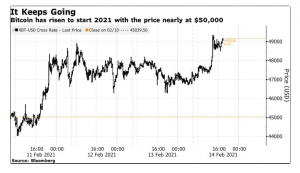Από ρεκόρ σε ρεκόρ πάει το bitcoin, που την Κυριακή 14 Φεβρουαρίου, ημέρα των ερωτευμένων, έσπασε για πρώτη φορά το φράγμα των 49.000 δολαρίων και πλησιάζει τα 50.000 δολάρια ανά νόμισμα.