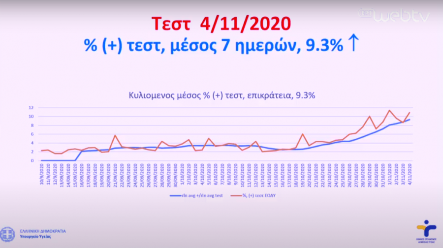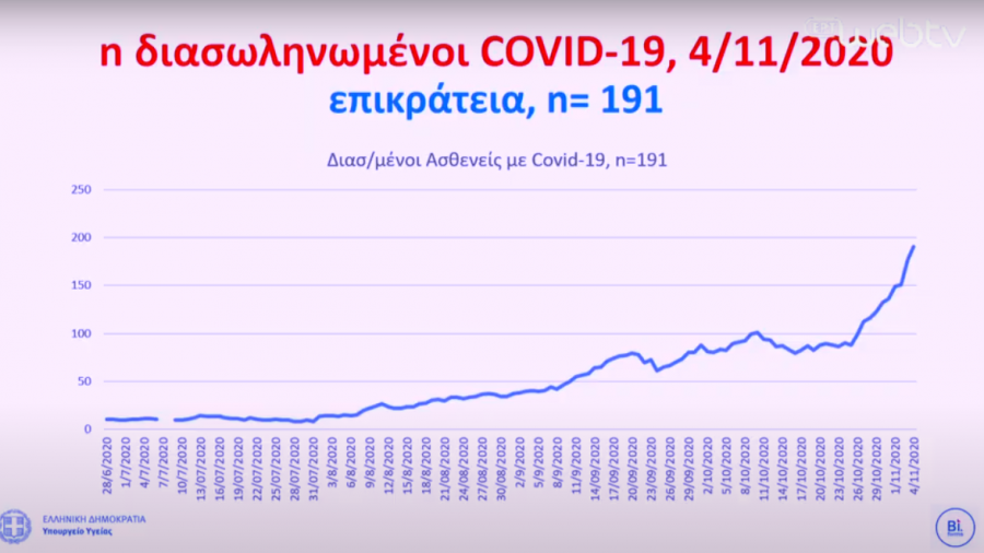 «Ο ιός κινείται με πολύ υψηλές ταχύτητες, με μια πολύ σημαντική μεταδοτικότητα τις τελευταίες ημέρες» υπογράμμισε ο Σωτήρης Τσιόδρας παρουσιάζοντας τα επιδημιολογικά δεδομένα που οδήγησαν την κυβέρνηση στην απόφαση να επιβάλει εκ νέου lockdown, από το πρωί του Σαββάτου 7 Νοεμβρίου.