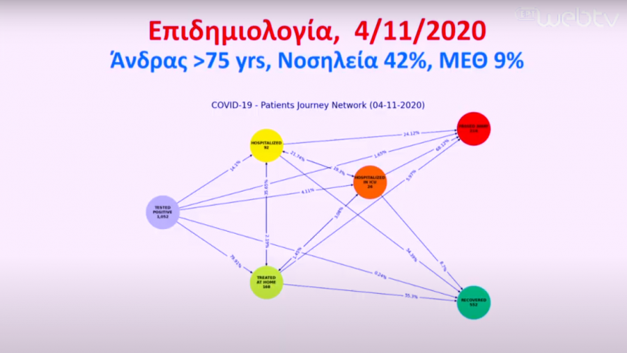 Τις τελευταίες 7 ημέρες περισσότερα από 1.000 άτομα άνω των 65 ετών, «στην ηλικία δηλαδή που κατά κάποιο τρόπο κλιμακώνεται ο κίνδυνος», έχουν αναγνωριστεί ως κρούσματα κορωνοϊού. «Αυτό από μόνο του είναι καθοριστικό» είπε ο κ. Τσίοδρας και εξήγησε: Με βάση τα ελληνικά δεδομένα, υπολογίζουμε πλέον με μαθηματικές εκτιμήσεις, ανάλογα με την ηλικία του ανθρώπου που πάσχει από κορωνοϊό να νοσηλευτεί στο νοσοκομείο ή ακόμα να μπει σε ΜΕΘ» και αυτή τη στιγμή η πιθανότητα για έναν άνδρα άνω των 75 ετών με κορωνοϊό είναι σημαντική.