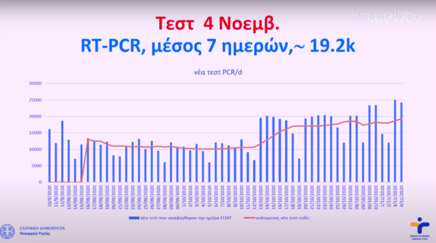 Στη συνέχεια, ο κ. Τσίοδρας παρουσίασε τα αριθμητικά δεδομένα για τον αριθμό των τεστ που διεξάγονται. «Από τις 10 Σεπτεμβρίου και μετά έχουμε 20πλασιάσει τα τεστ που γίνονται» με μέσο όρο πάνω από 19.000 τεστ την ημέρα και επιπλέον 3.000 rapid τεστ, ενώ προγραμματίζονται και αυτοματοποιημένοι έλεγχοι σε όλη την Επικράτεια.