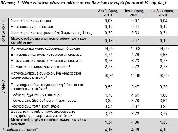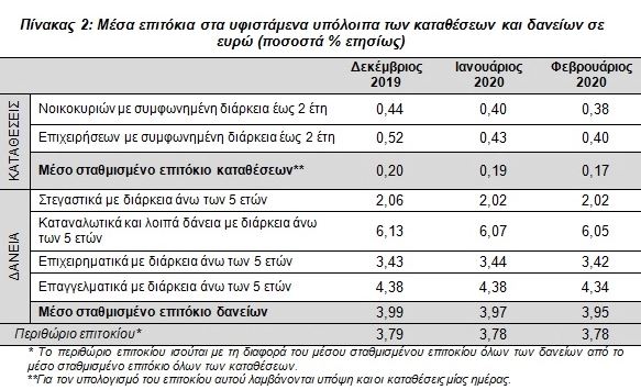 Σχεδόν αμετάβλητο παρέμεινε, το Φεβρουάριο του 2020, το μέσο σταθμισμένο επιτόκιο του συνόλου των νέων καταθέσεων, ενώ το αντίστοιχο επιτόκιο των νέων δανείων μειώθηκε. Το περιθώριο επιτοκίου μειώθηκε στις 4,15 εκατοστιαίες μονάδες.