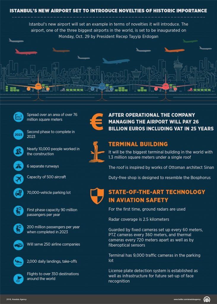Η συνολική έκταση του project είναι 76,5 τ.χλμ, μεγαλύτερο από το Μανχάταν (σ.σ. το οποίο έχει έκταση περίπου 60 τ.χλμ), όπως χαρακτηριστικά είπε ο κ. Polat, ενώ έχει ολοκληρωθεί η πρώτη φάση λειτουργίας του (συνολικά πέντε φάσεις μέχρι το 2031). Σήμερα μπορεί να εξυπηρετήσει 90 εκατομμύρια επιβάτες, αλλά όταν ολοκληρωθεί το έργο θα μπορεί να εξυπηρετεί περί τα 200 εκατομμύρια ετησίως. Από τότε που ξεκίνησε τη λειτουργία του στις 6 Απριλίου του 2019 και μέχρι τις 15 Σεπτεμβρίου έχουν μετακινηθεί πάνω από 32 εκατ. επιβάτες, αριθμός που αντιστοιχεί σε 200.815 πτήσεις εσωτερικού και εξωτερικού.